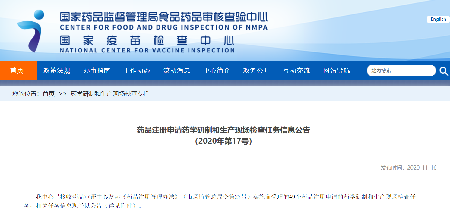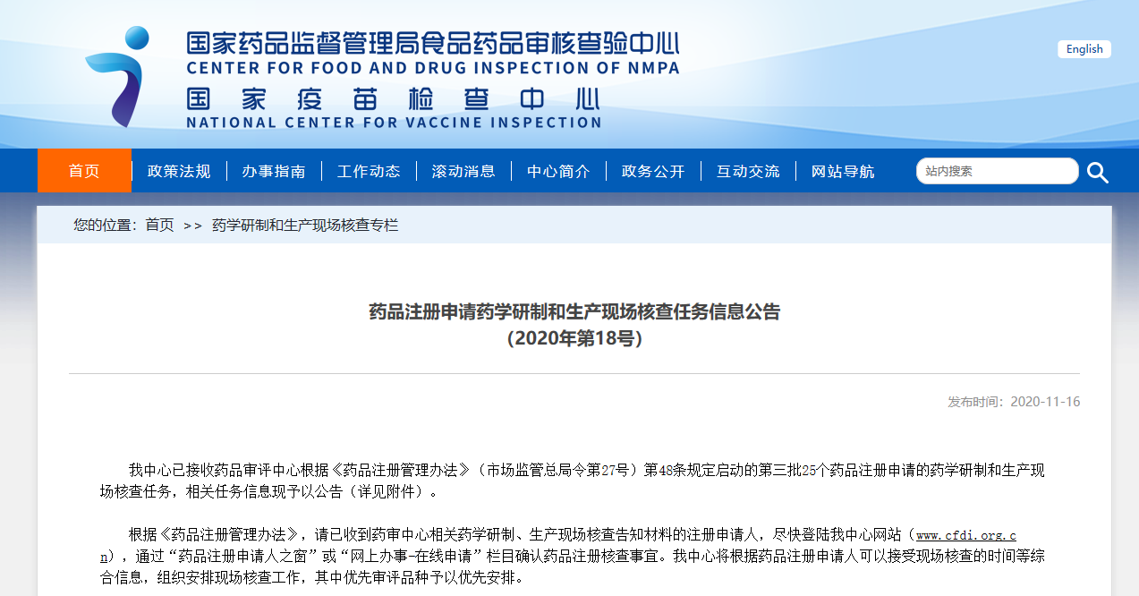 藥品注冊申請藥學(xué)研制和生產(chǎn)現(xiàn)場檢查任務(wù)信息公告