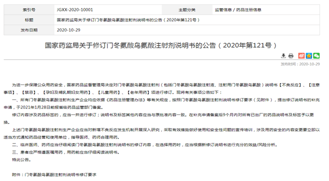 為進(jìn)一步保障公眾用藥安全,國(guó)家藥品監(jiān)督管理局決定對(duì)門冬氨酸鳥氨酸注射劑(包括門冬氨酸鳥氨酸注射液、注射用門冬氨酸鳥氨酸)說明書項(xiàng)進(jìn)行修訂,各持有人須參照修訂要求,提出修訂說明書的補(bǔ)充申請(qǐng),于2021年1月28日前報(bào)省級(jí)藥品監(jiān)管部門備案,并在補(bǔ)充申請(qǐng)備案后9個(gè)月內(nèi)對(duì)所有已出廠的藥品說明書及標(biāo)簽予以更換。