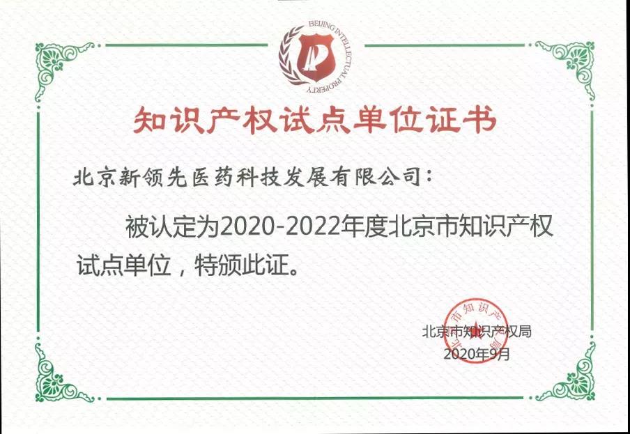 北京新領(lǐng)先醫(yī)藥科技發(fā)展有限公司被北京市知識產(chǎn)權(quán)局認(rèn)定為“北京市知識產(chǎn)權(quán)試點單位”。此次認(rèn)定是新領(lǐng)先繼2019年成功通過知識產(chǎn)權(quán)管理體系認(rèn)證后,榮獲的又一項知識產(chǎn)權(quán)相關(guān)的榮譽資質(zhì)。