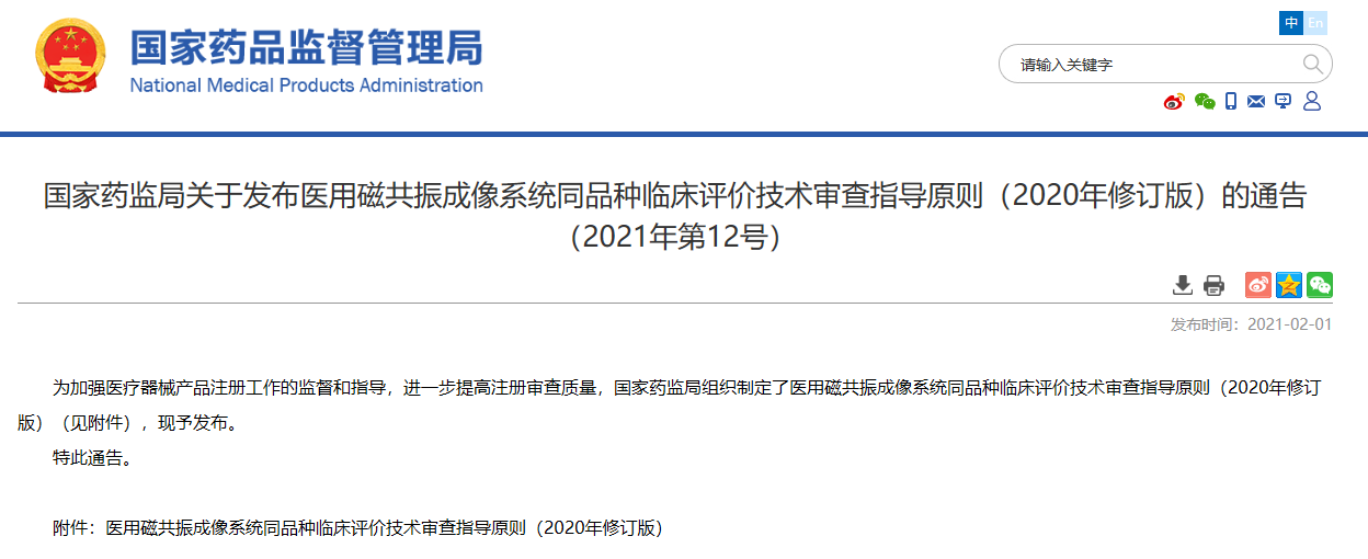 關(guān)于發(fā)布醫(yī)用磁共振成像系統(tǒng)同品種臨床評(píng)價(jià)技術(shù)審查指導(dǎo)原則(2020年修訂版)的通告(2021年第12號(hào))