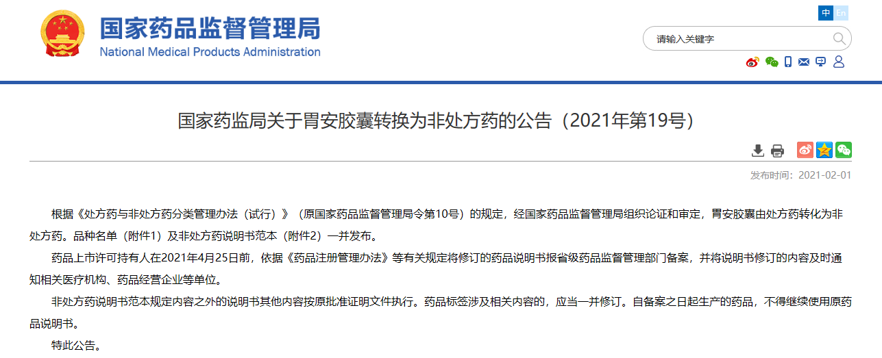關(guān)于胃安膠囊轉(zhuǎn)換為非處方藥的公告(2021年第19號(hào))