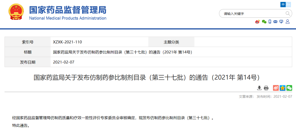 關(guān)于發(fā)布仿制藥參比制劑目錄(第三十七批)的通告(2021年 第14號(hào))