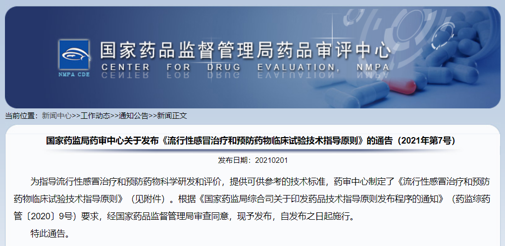關(guān)于發(fā)布《流行性感冒治療和預(yù)防藥物臨床試驗(yàn)技術(shù)指導(dǎo)原則》的通告(2021年第7號(hào))