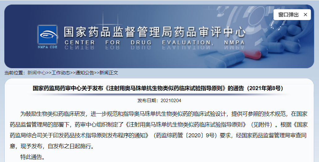 關(guān)于發(fā)布《注射用奧馬珠單抗生物類(lèi)似藥臨床試驗(yàn)指導(dǎo)原則》的通告(2021年第8號(hào))