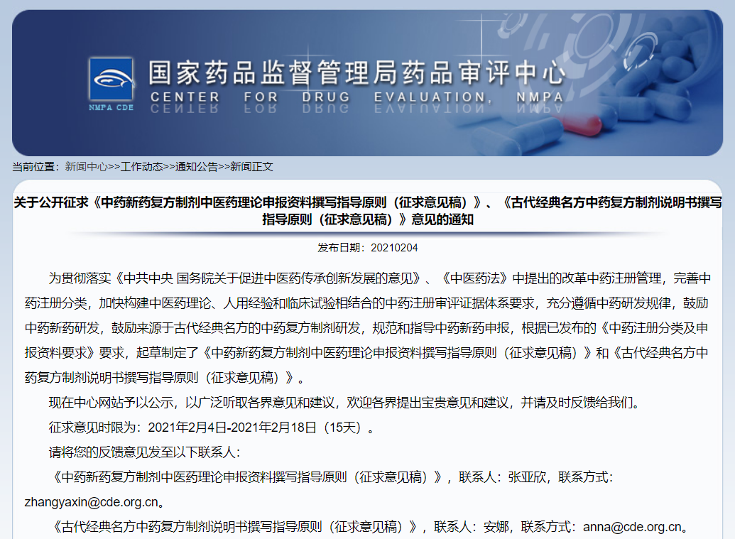 關(guān)于公開(kāi)征求《中藥新藥復(fù)方制劑中醫(yī)藥理論申報(bào)資料撰寫(xiě)指導(dǎo)原則(征求意見(jiàn)稿)》、《古代經(jīng)典名方中藥復(fù)方制劑說(shuō)明書(shū)撰寫(xiě)指導(dǎo)原則(征求意見(jiàn)稿)》意見(jiàn)的通知