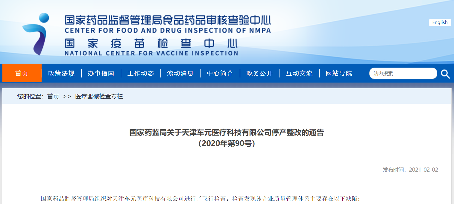 關(guān)于天津車(chē)元醫(yī)療科技有限公司停產(chǎn)整改的通告(2020年第90號(hào))