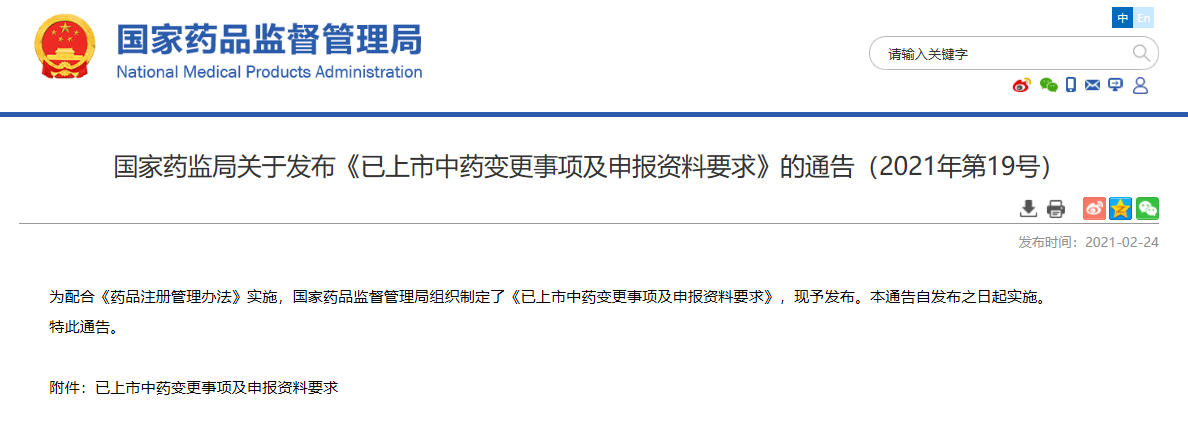 關(guān)于發(fā)布《已上市中藥變更事項及申報資料要求》的通告(2021年第19號)