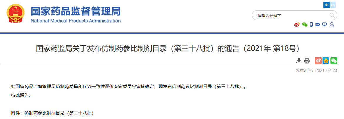 關(guān)于發(fā)布仿制藥參比制劑目錄(第三十八批)的通告(2021年 第18號)