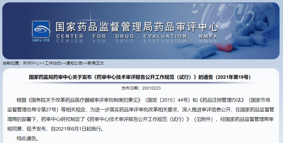 關(guān)于發(fā)布《藥審中心技術(shù)審評報告公開工作規(guī)范(試行)》的通告(2021年第19號)