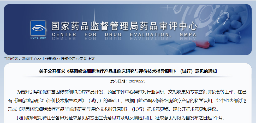 關(guān)于公開征求《基因修飾細胞治療產(chǎn)品非臨床研究與評價技術(shù)指導(dǎo)原則》(試行)意見的通知