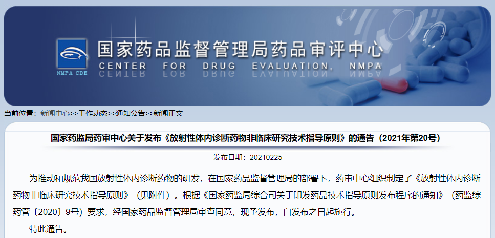 關(guān)于發(fā)布《放射性體內(nèi)診斷藥物非臨床研究技術(shù)指導(dǎo)原則》的通告(2021年第20號)