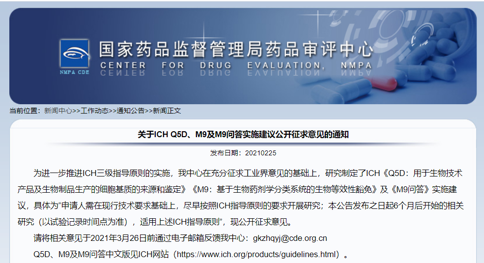 關(guān)于ICH Q5D、M9及M9問答實施建議公開征求意見的通知