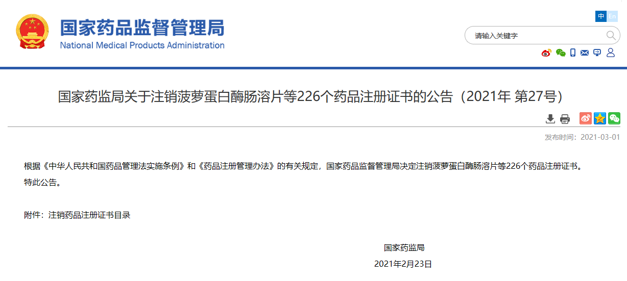 國家藥監(jiān)局關(guān)于注銷菠蘿蛋白酶腸溶片等226個(gè)藥品注冊(cè)證書的公告(2021年 第27號(hào))