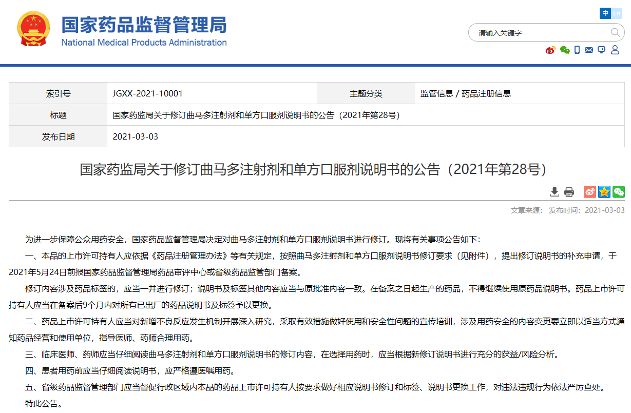 關(guān)于修訂曲馬多注射劑和單方口服劑說明書的公告(2021年第28號(hào))