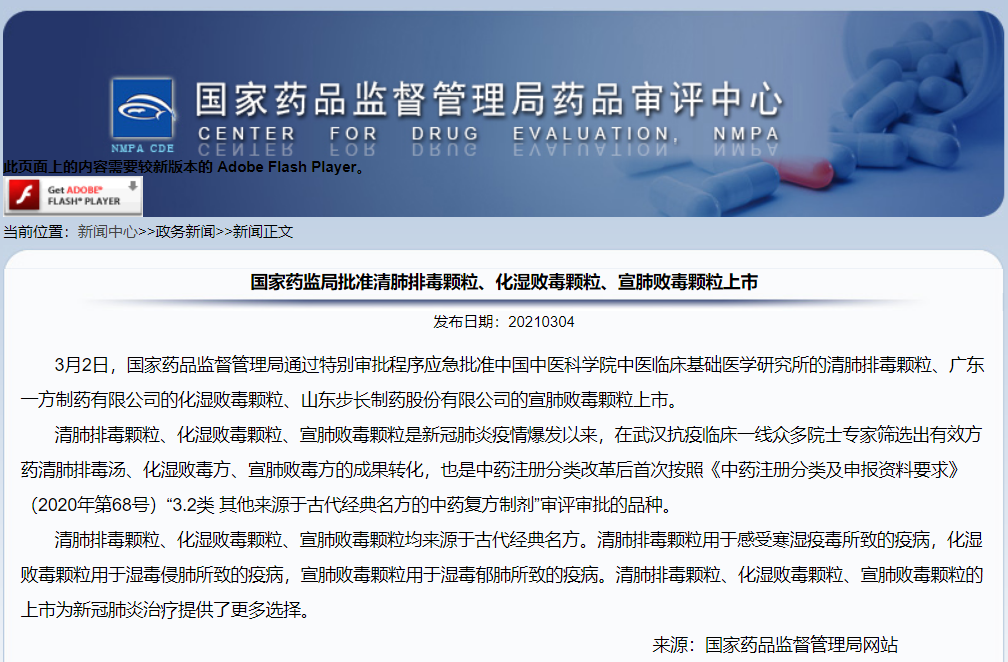 國家藥監(jiān)局批準(zhǔn)清肺排毒顆粒、化濕敗毒顆粒、宣肺敗毒顆粒上市