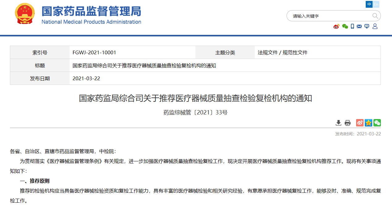 國家藥監(jiān)局綜合司關于推薦醫(yī)療器械質(zhì)量抽查檢驗復檢機構的通知