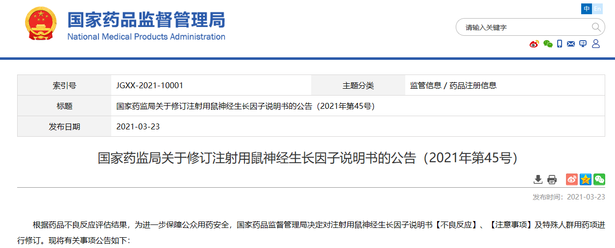 國家藥監(jiān)局關于修訂注射用鼠神經(jīng)生長因子說明書的公告(2021年第45號)