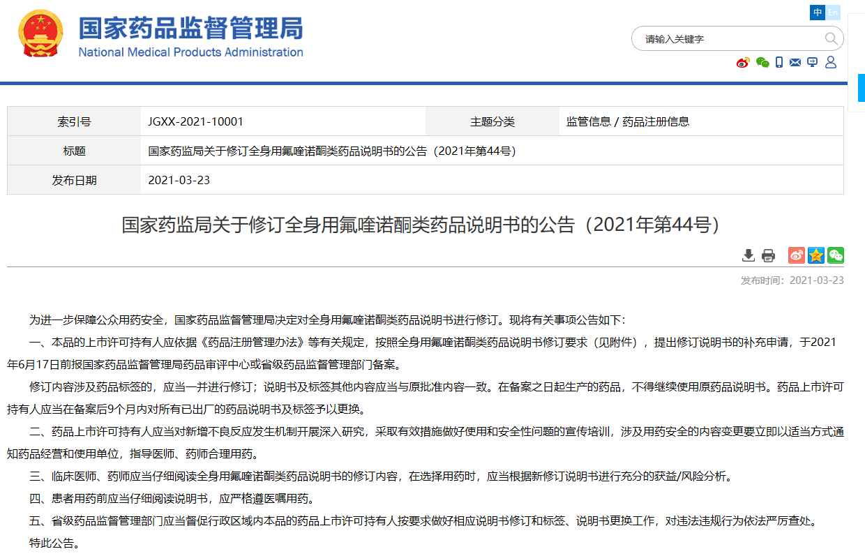 國家藥監(jiān)局關于修訂全身用氟喹諾酮類藥品說明書的公告(2021年第44號)