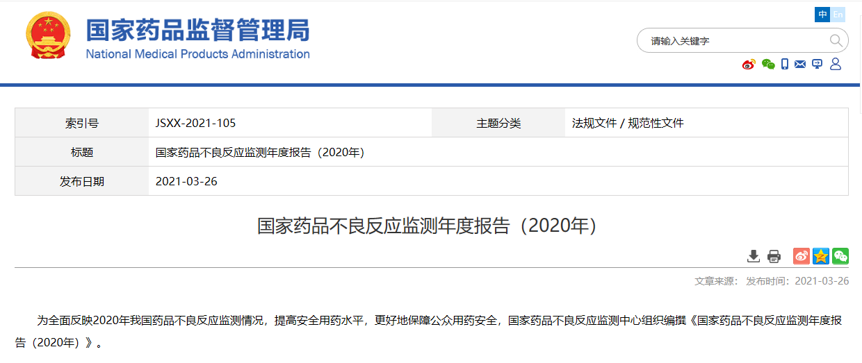 國家藥品不良反應監(jiān)測年度報告(2020年)