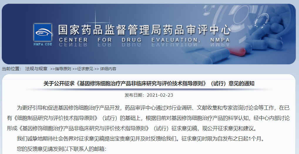關于公開征求《基因修飾細胞治療產(chǎn)品非臨床研究與評價技術指導原則》(試行)意見的通知