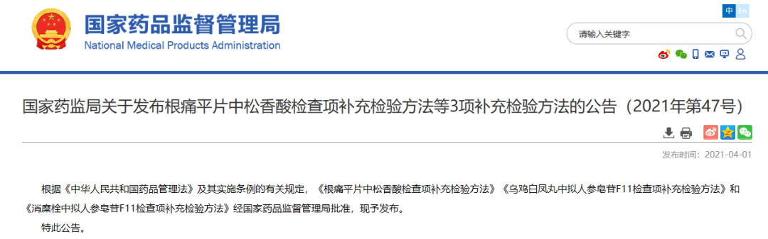 國家藥監(jiān)局關(guān)于發(fā)布根痛平片中松香酸檢查項(xiàng)補(bǔ)充檢驗(yàn)方法等3項(xiàng)補(bǔ)充檢驗(yàn)方法的公告(2021年第47號(hào))