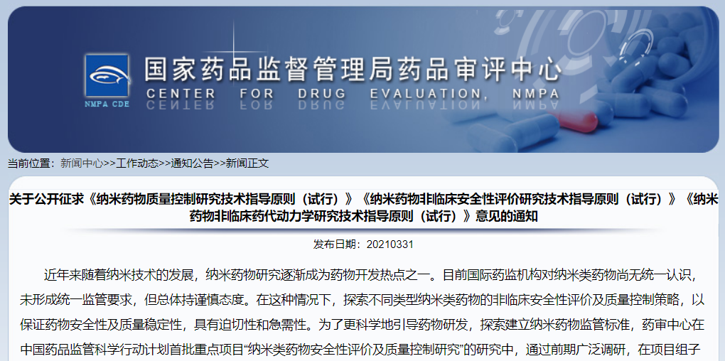 關(guān)于公開征求《納米藥物質(zhì)量控制研究技術(shù)指導(dǎo)原則(試行)》《納米藥物非臨床安全性評(píng)價(jià)研究技術(shù)指導(dǎo)原則(試行)》《納米藥物非臨床藥代動(dòng)力學(xué)研究技術(shù)指導(dǎo)原則(試行)》意見的通知(2021-03-31)