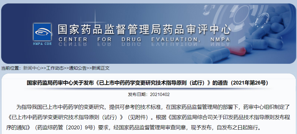 國家藥監(jiān)局藥審中心關(guān)于發(fā)布《已上市中藥藥學(xué)變更研究技術(shù)指導(dǎo)原則(試行)》的通告(2021年第26號(hào))
