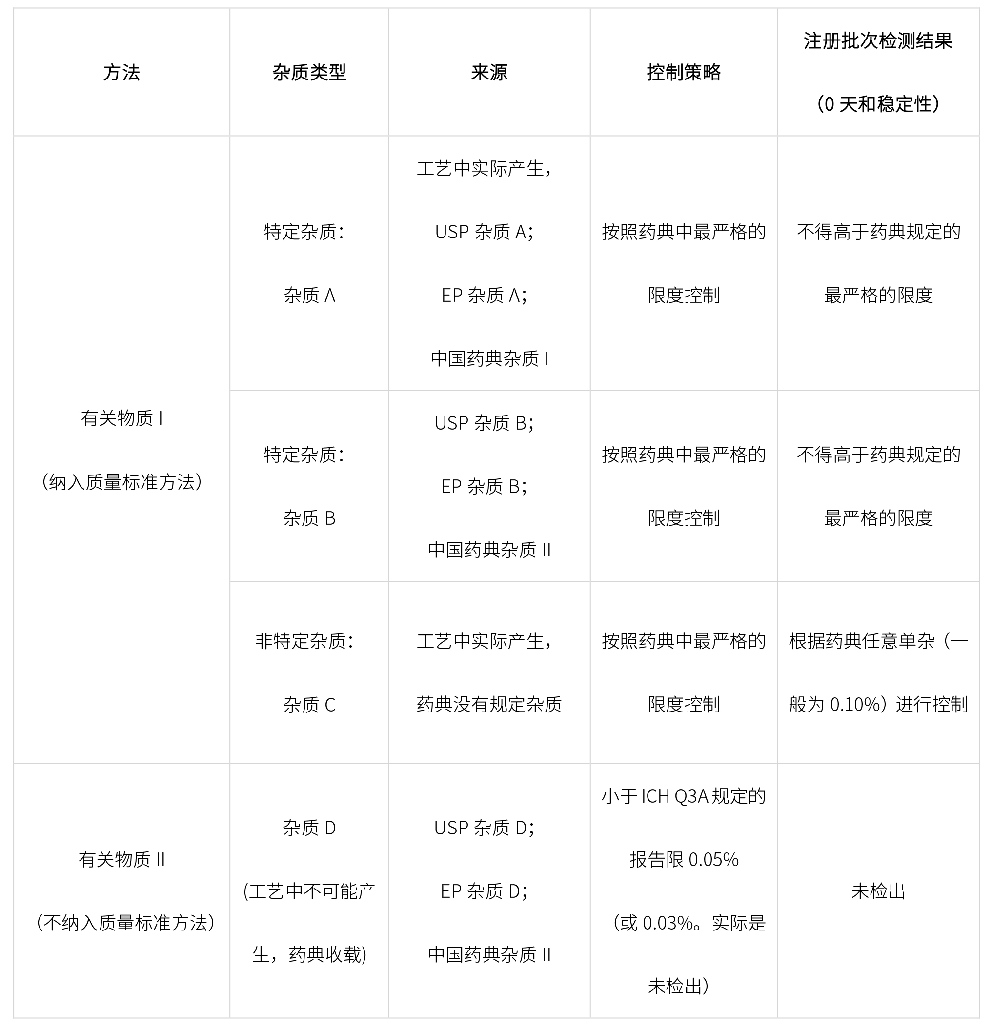 重點(diǎn):有機(jī)雜質(zhì)研究范圍需要包括所有藥典(包括USP, EP, ChP, JP及其他法定標(biāo)準(zhǔn),如進(jìn)口注冊標(biāo)準(zhǔn),藥品注冊標(biāo)準(zhǔn)等)收載相關(guān)雜質(zhì),無論原料藥工藝是否產(chǎn)生。