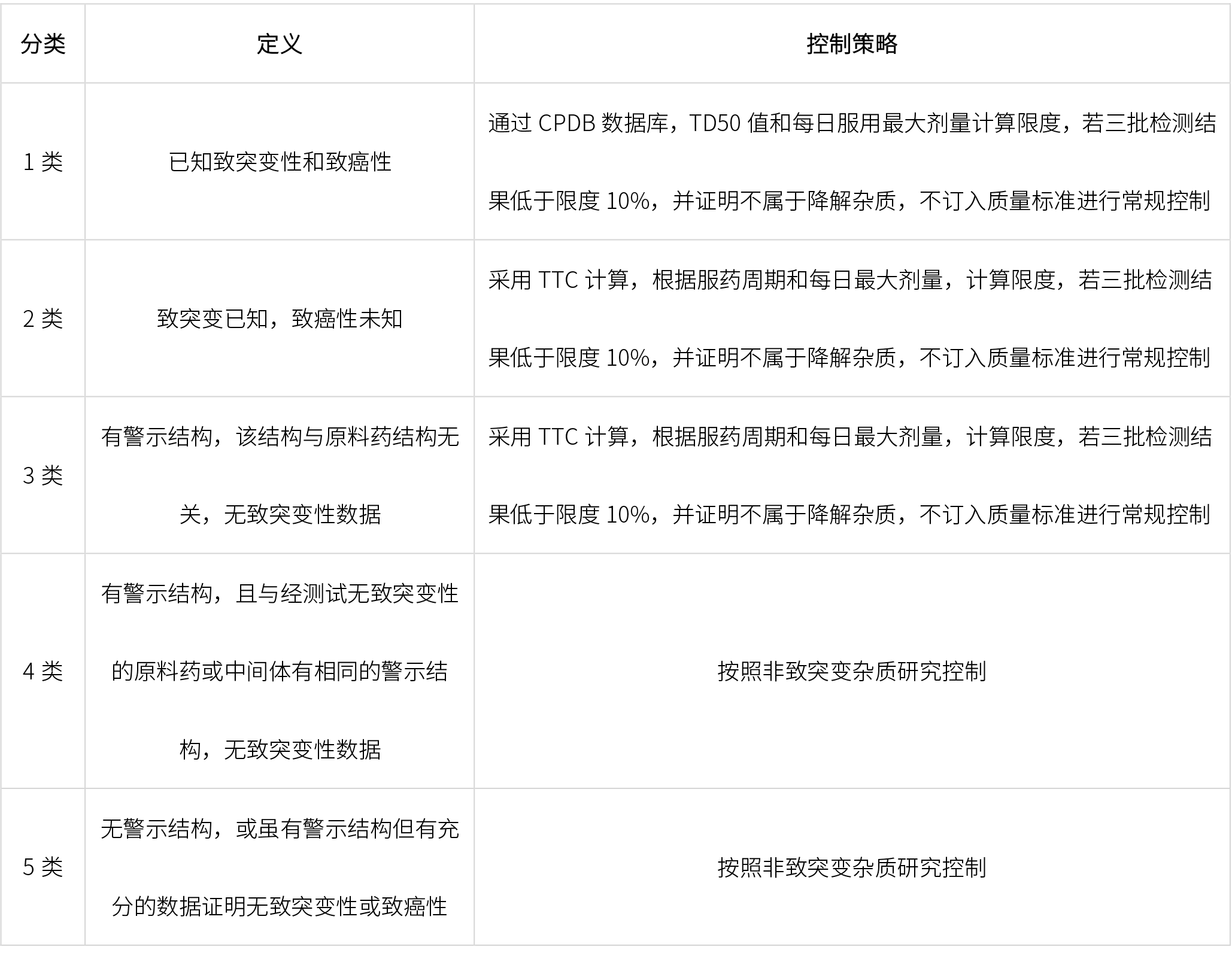 根據(jù)生產(chǎn)工藝和警示結(jié)構(gòu),確定產(chǎn)生致突變雜質(zhì),并依據(jù)ICH M7進(jìn)行如下分類,確定相應(yīng)的控制限度。