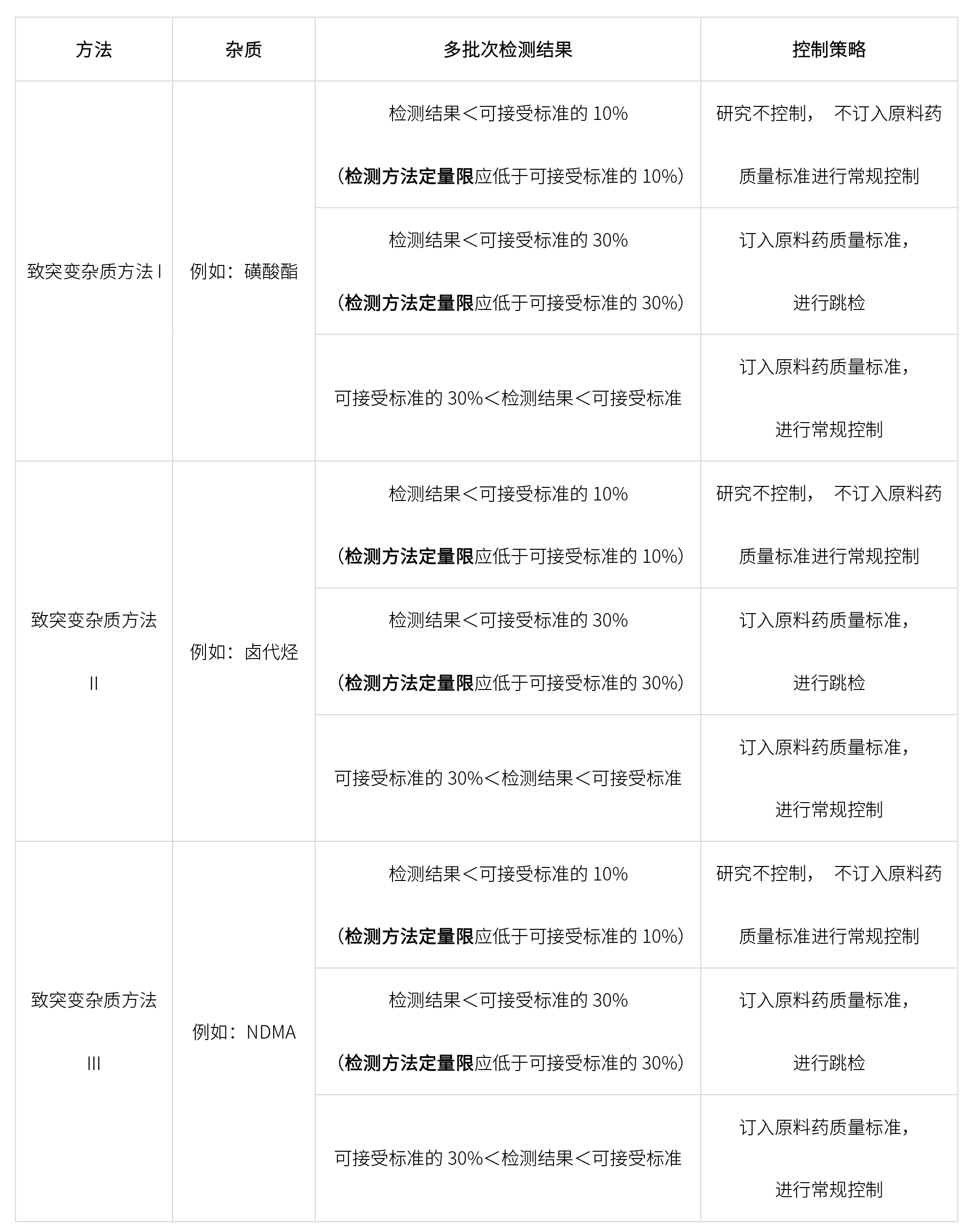 開發(fā)致突變雜質(zhì)相關(guān)方法檢測原料藥中致突變雜質(zhì),雜質(zhì)控制策略如下: