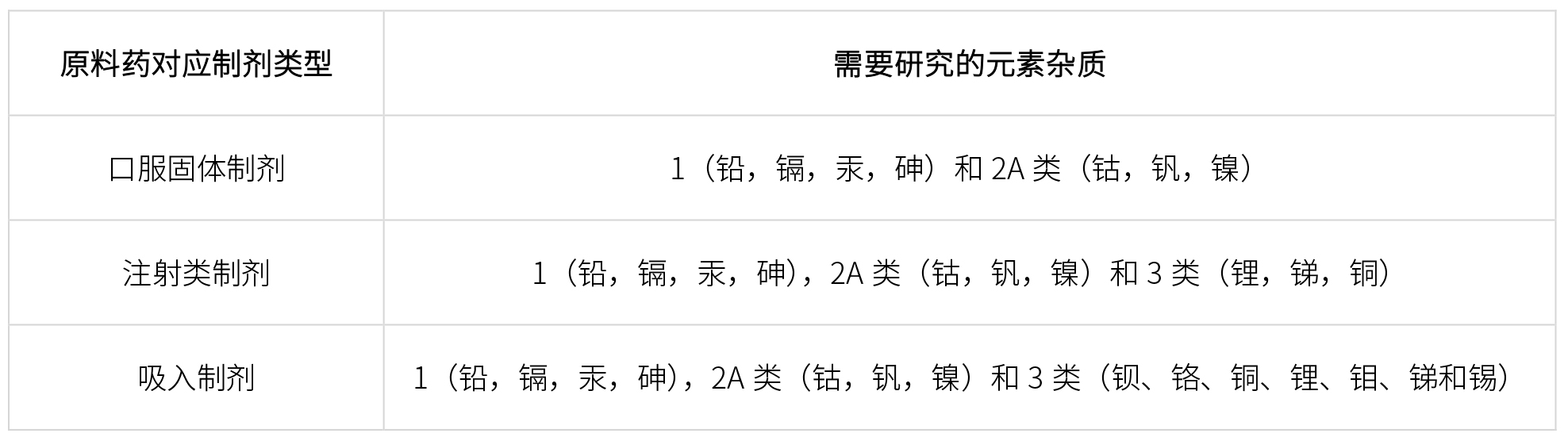 根據(jù)ICH Q3D指導(dǎo)原則,不同類型原料藥至少需要研究如下元素雜質(zhì):