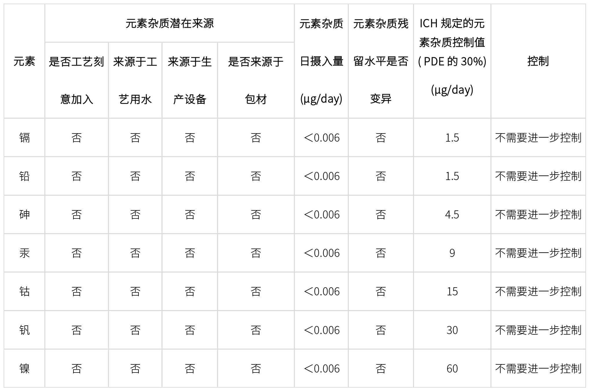 經(jīng)過上述一系列風(fēng)險(xiǎn)評(píng)估和相關(guān)檢測數(shù)據(jù),確定原料藥中元素雜質(zhì)最終控制策略: