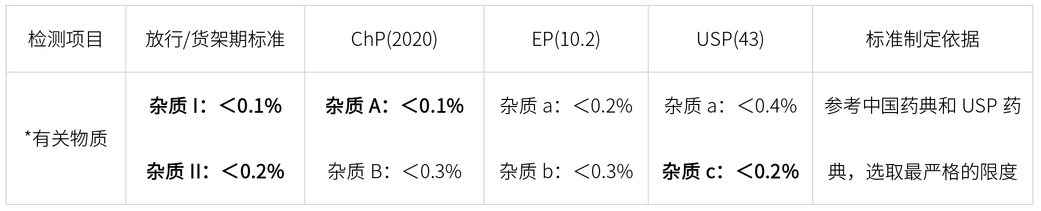 API質(zhì)量標(biāo)準(zhǔn),應(yīng)參照所有相關(guān)藥典,檢測項(xiàng)目覆蓋所有藥典,檢測限度選取藥典最嚴(yán)格的限度制定,如下: