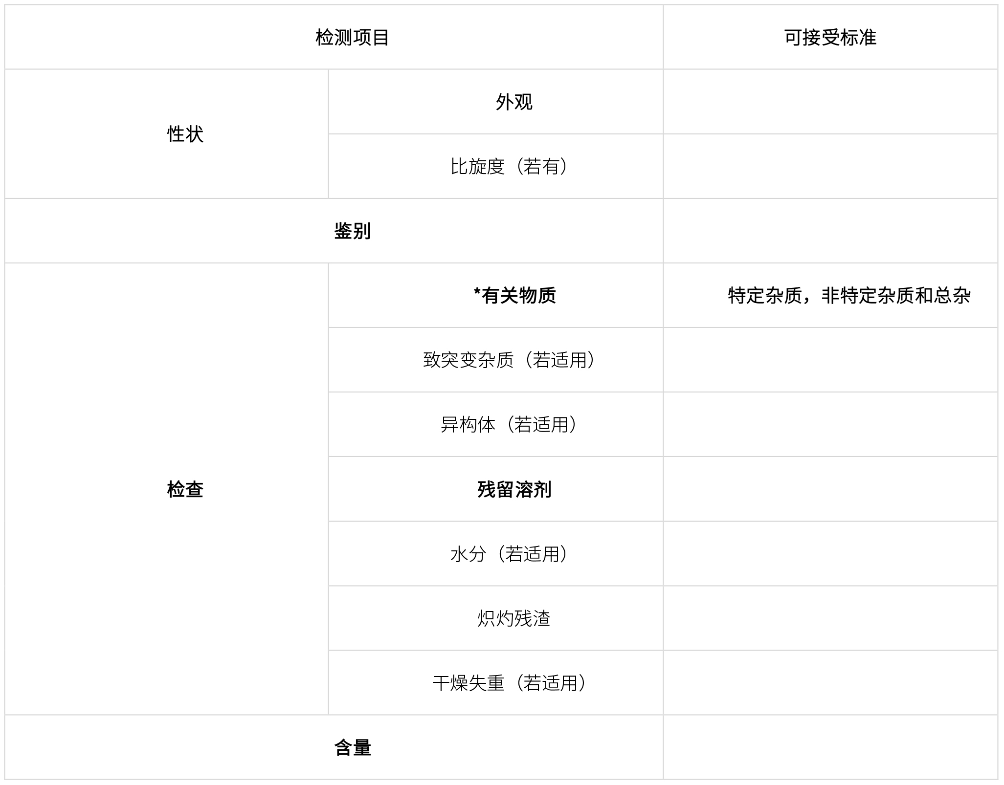 (*加粗字體,標(biāo)準(zhǔn)中必須包含項(xiàng)目,常規(guī)字體根據(jù)實(shí)際檢測結(jié)果定是否增訂入質(zhì)量標(biāo)準(zhǔn))