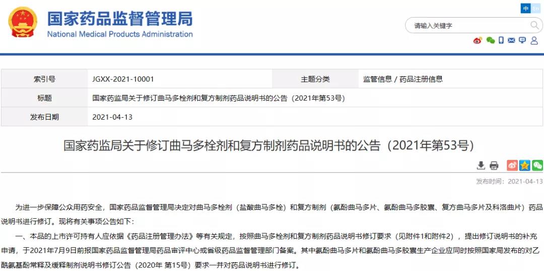 國(guó)家藥監(jiān)局關(guān)于修訂曲馬多栓劑和復(fù)方制劑藥品說(shuō)明書(shū)的公告(2021年第53號(hào))