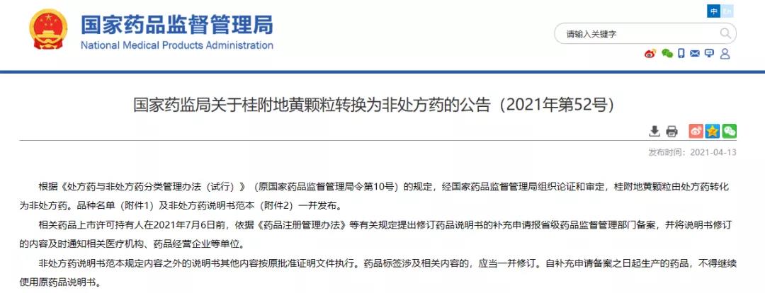 國(guó)家藥監(jiān)局關(guān)于桂附地黃顆粒轉(zhuǎn)換為非處方藥的公告(2021年第52號(hào))