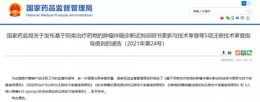 國(guó)家藥監(jiān)局關(guān)于發(fā)布基于同類(lèi)治療藥物的腫瘤伴隨診斷試劑說(shuō)明書(shū)更新與技術(shù)審查等5項(xiàng)注冊(cè)技術(shù)審查指導(dǎo)原則的通告(2021年第24號(hào))
