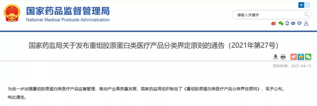 國(guó)家藥監(jiān)局關(guān)于發(fā)布重組膠原蛋白類(lèi)醫(yī)療產(chǎn)品分類(lèi)界定原則的通告(2021年第27號(hào))
