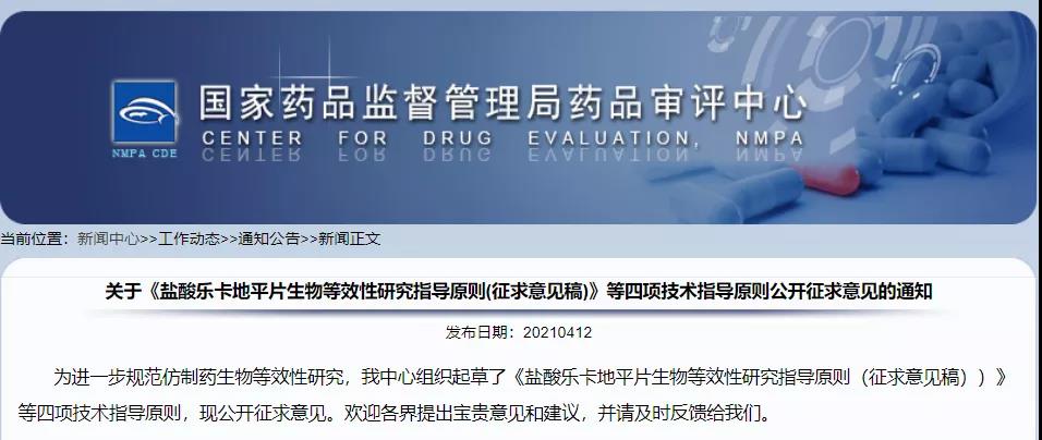 關(guān)于《鹽酸樂(lè)卡地平片生物等效性研究指導(dǎo)原則(征求意見(jiàn)稿)》等四項(xiàng)技術(shù)指導(dǎo)原則公開(kāi)征求意見(jiàn)的通知