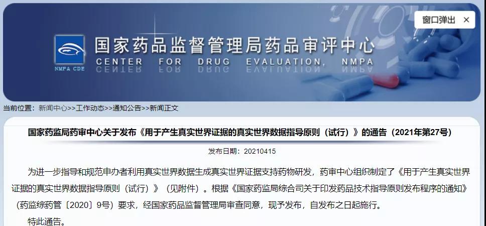 國(guó)家藥監(jiān)局藥審中心關(guān)于發(fā)布《用于產(chǎn)生真實(shí)世界證據(jù)的真實(shí)世界數(shù)據(jù)指導(dǎo)原則(試行)》的通告(2021年第27號(hào))