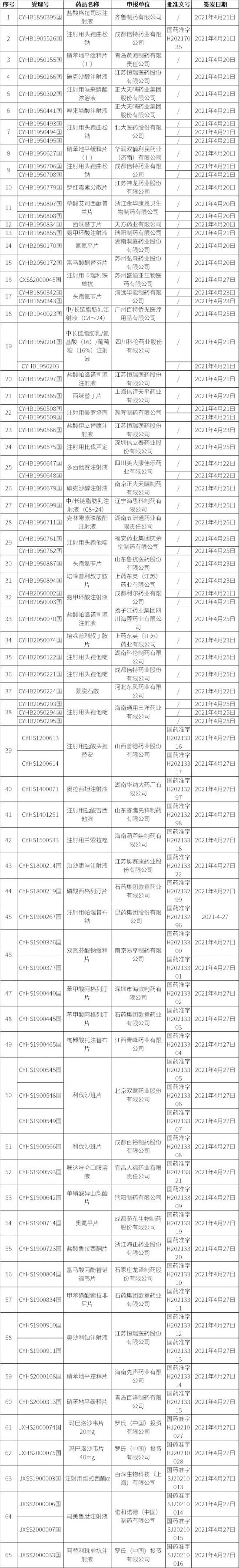 本周共有65個品種獲得藥品批準(zhǔn)證明文件,其中一致性評價品種35個,注射劑品種35個。
