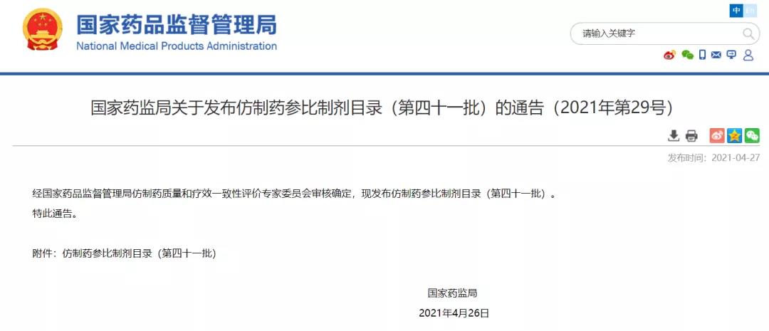 國家藥監(jiān)局關(guān)于發(fā)布仿制藥參比制劑目錄(第四十一批)的通告(2021年第29號)
