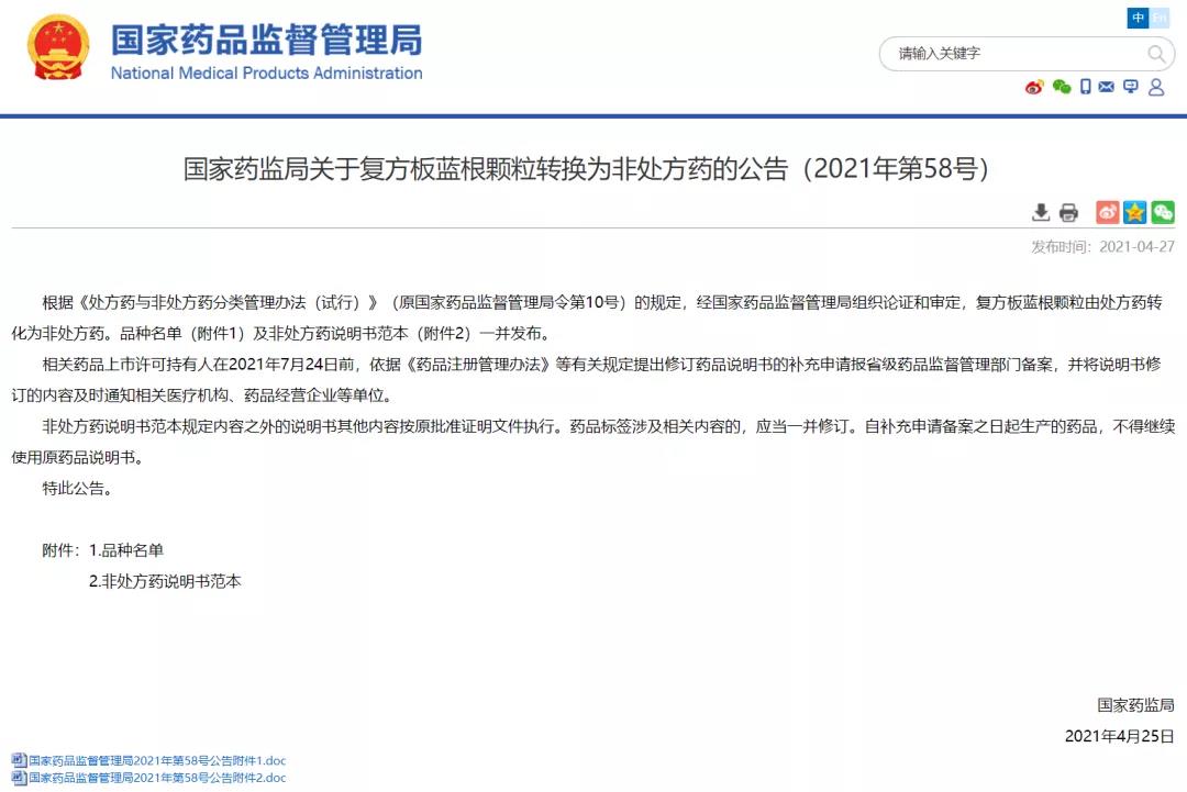 國家藥監(jiān)局關(guān)于復(fù)方板藍(lán)根顆粒轉(zhuǎn)換為非處方藥的公告(2021年第58號)