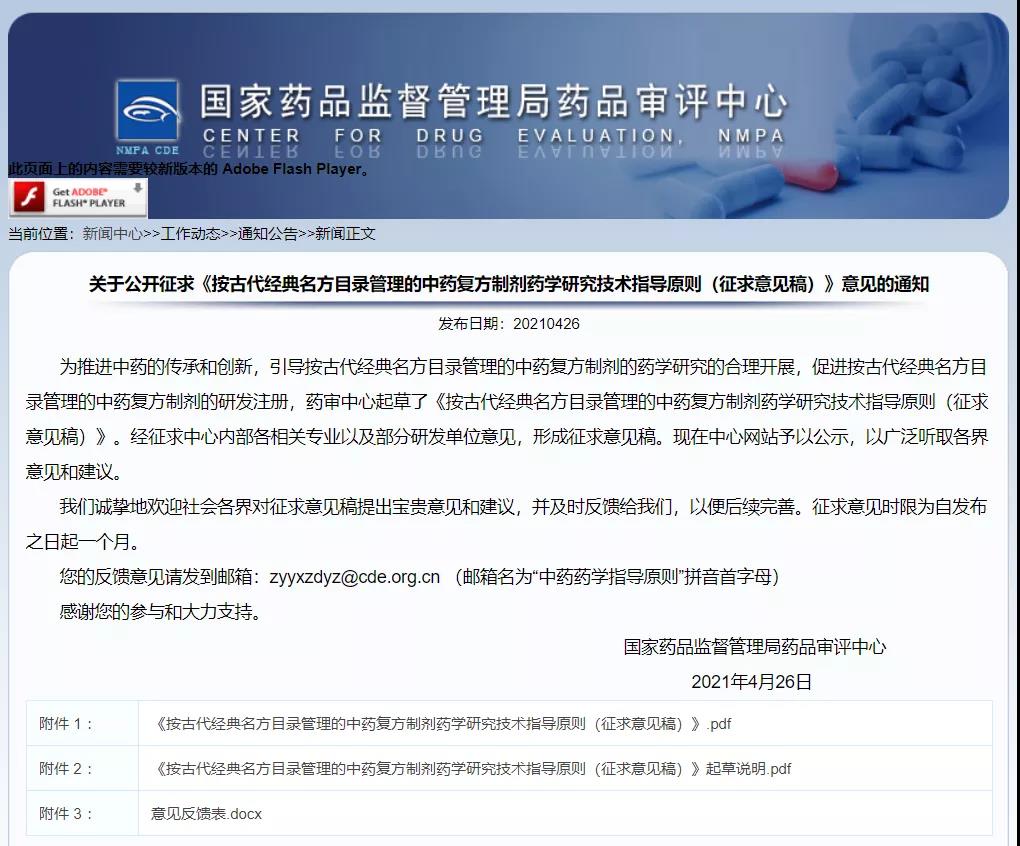 關(guān)于公開征求《按古代經(jīng)典名方目錄管理的中藥復(fù)方制劑藥學(xué)研究技術(shù)指導(dǎo)原則(征求意見稿)》意見的通知