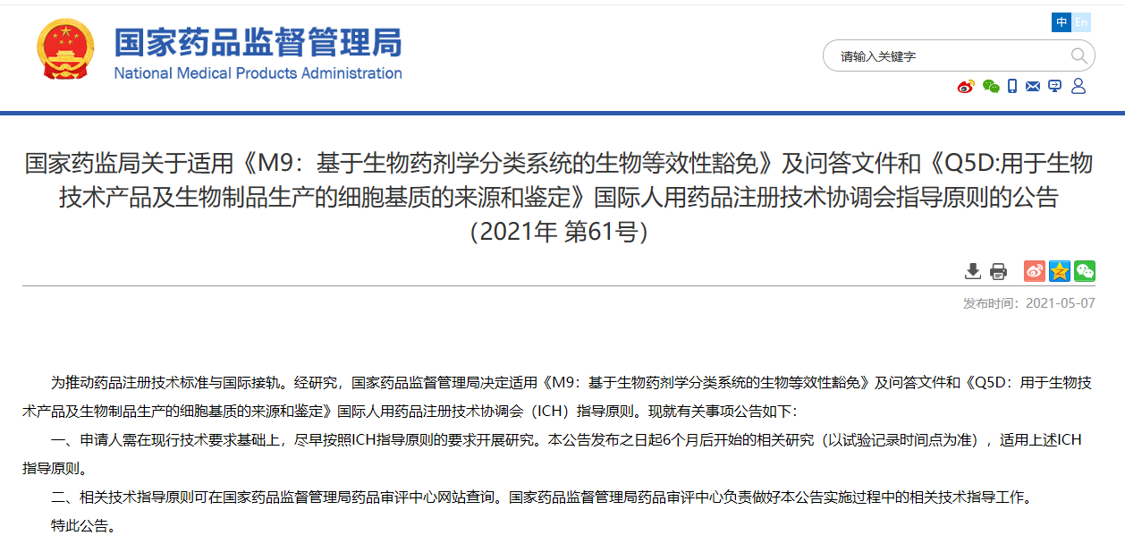 關(guān)于適用《M9:基于生物藥劑學(xué)分類系統(tǒng)的生物等效性豁免》及問答文件和《Q5D:用于生物技術(shù)產(chǎn)品及生物制品生產(chǎn)的細(xì)胞基質(zhì)的來源和鑒定》國際人用藥品注冊技術(shù)協(xié)調(diào)會指導(dǎo)原則的公告(2021年 第61號)