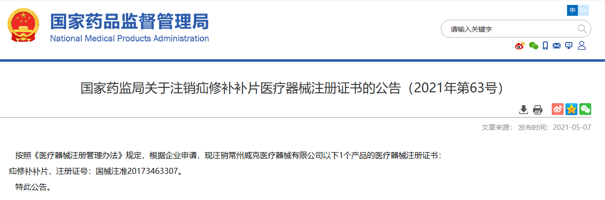 關(guān)于注銷疝修補(bǔ)補(bǔ)片醫(yī)療器械注冊證書的公告(2021年第63號)
