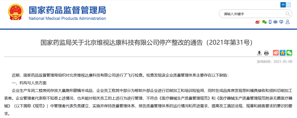 關(guān)于北京維視達(dá)康科技有限公司停產(chǎn)整改的通告(2021年第31號)
