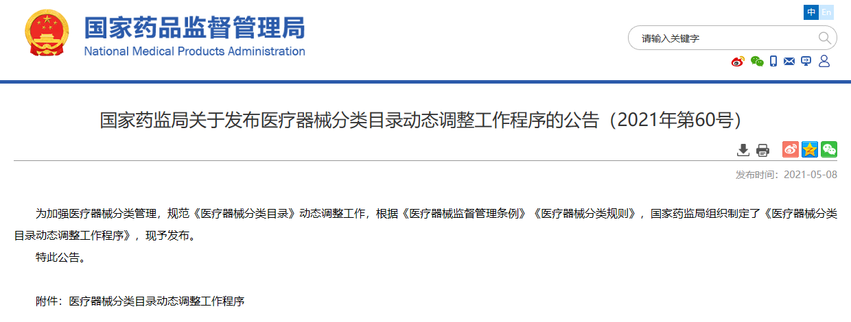 關(guān)于發(fā)布醫(yī)療器械分類目錄動態(tài)調(diào)整工作程序的公告(2021年第60號)