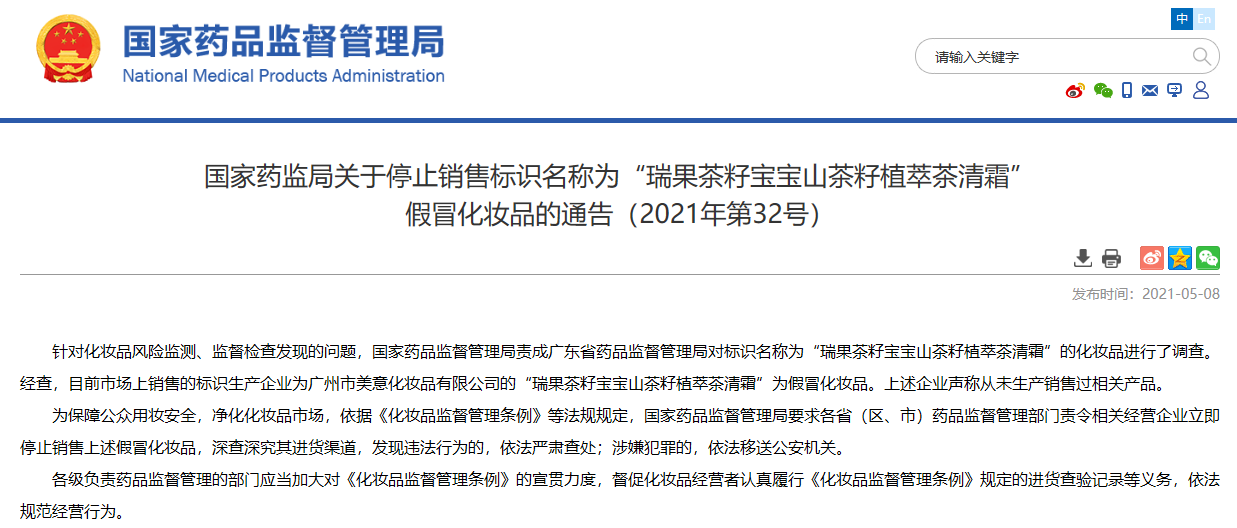 關(guān)于停止銷售標(biāo)識名稱為“瑞果茶籽寶寶山茶籽植萃茶清霜”假冒化妝品的通告(2021年第32號)