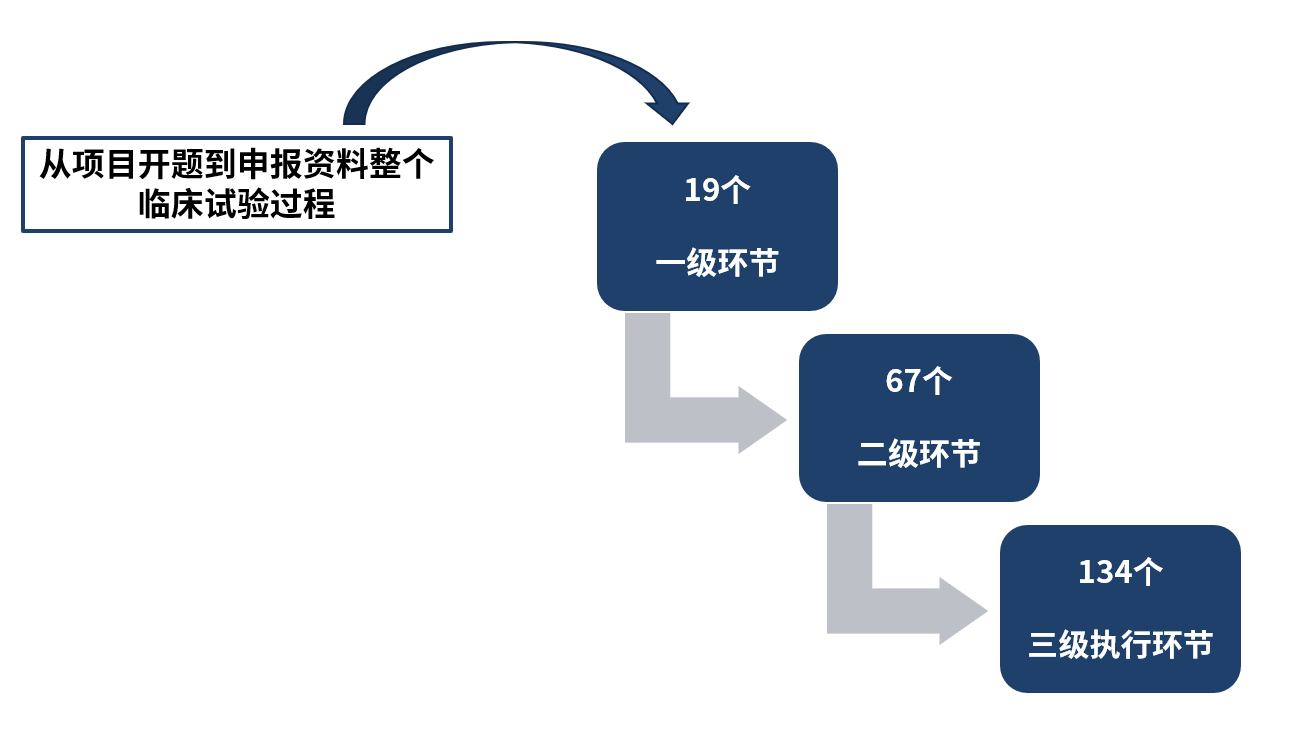 臨床試驗,從開題、合作方篩選、倫理審查、啟動入組等至最后提交注冊申報資料,共分為: 19個一級環(huán)節(jié); 包含67個二級環(huán)節(jié); 各基于風(fēng)險控制角度,共有134個三級執(zhí)行環(huán)節(jié)。